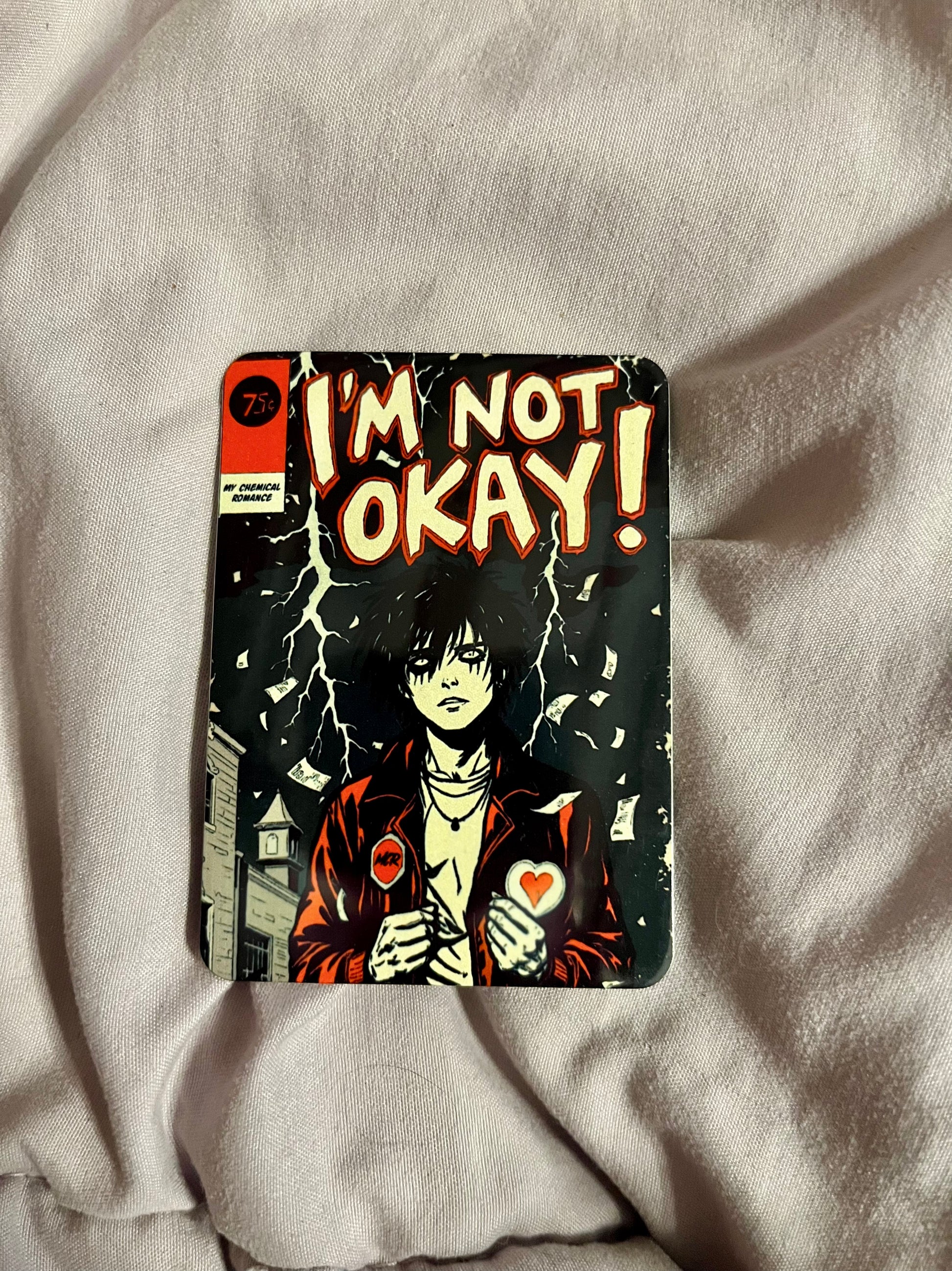 Emotional, dramatic, and instantly iconic, this fridge magnet brings My Chemical Romance’s I’m Not Okay (I Promise) to life in bold, comic-inspired pop art style. Featuring striking typography, vivid colors, and emo-pop flair, this magnet turns one of the band’s most legendary hits into a collectible accessory for your fridge, locker, or magnetic board.